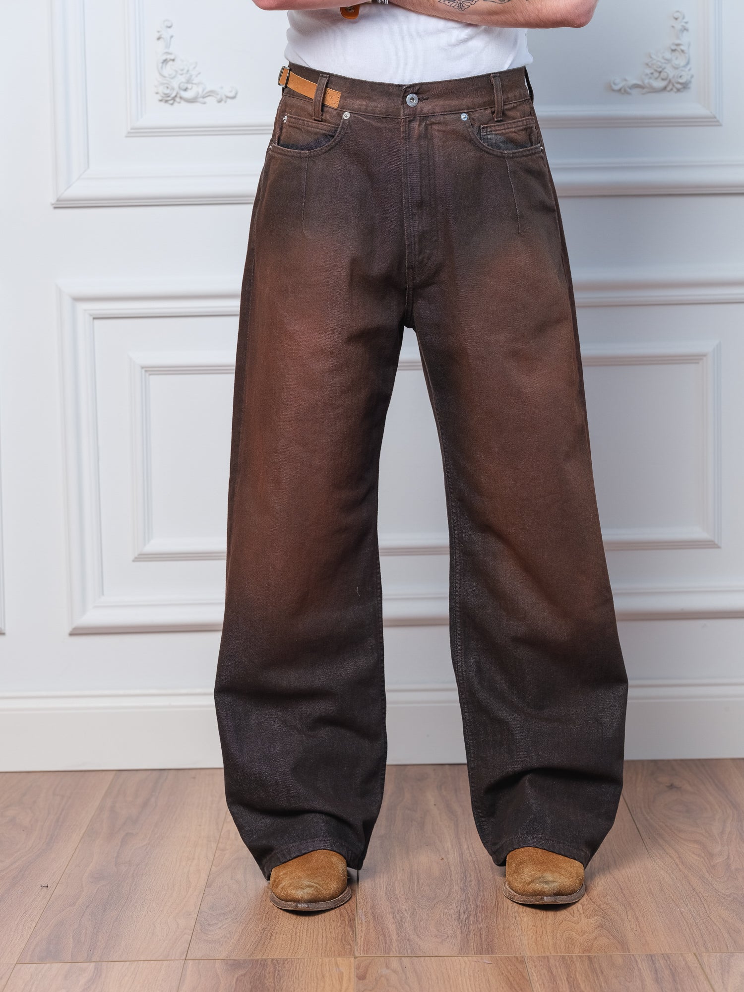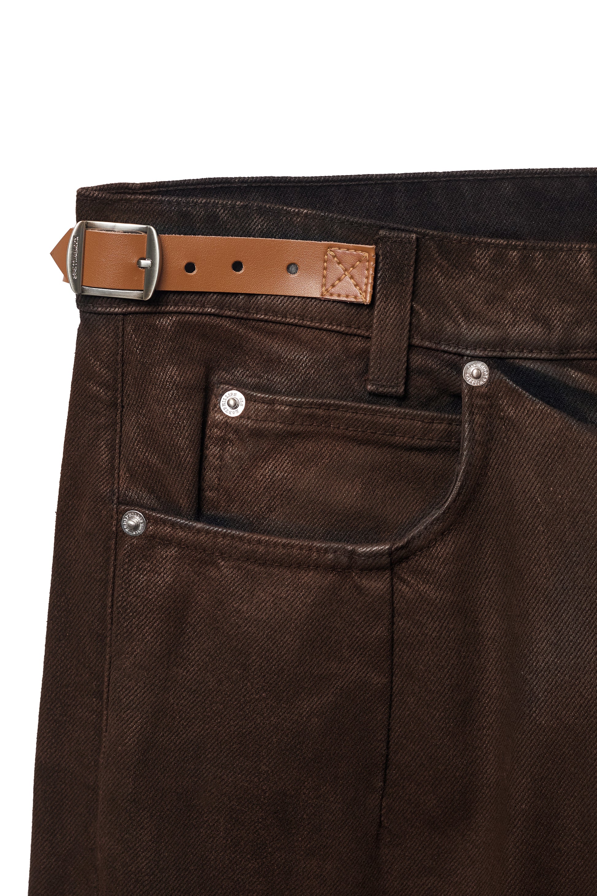 Runs Slightly Big. If In-Between Sizes, Size Down. Mid-High Waisted Fit. Jeans Sit Right Below Belly Button. Adjustable Leather Strap at Waist. Waist Can Be Tightened Approximately 2" Using Adjustment Strap.