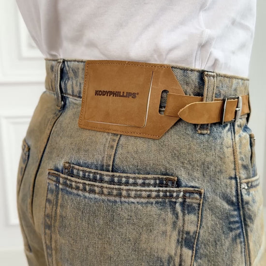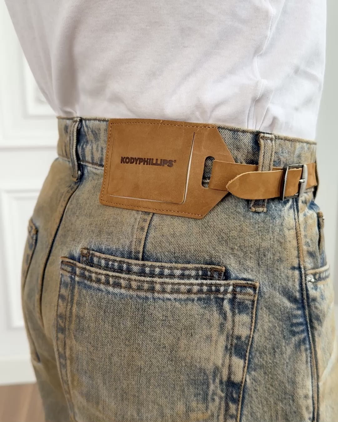 Runs True To Size. Mid-High Waisted Fit. Jeans Sit Right Below Belly Button. Adjustable Leather Strap at Waist. Waist Can Be Tightened Approximately 2" Using Adjustment Strap.
